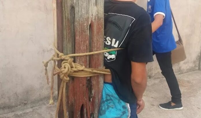 Os policiais militares encontraram o suspeito amarrado por cordas em um poste de energia na localidade.
