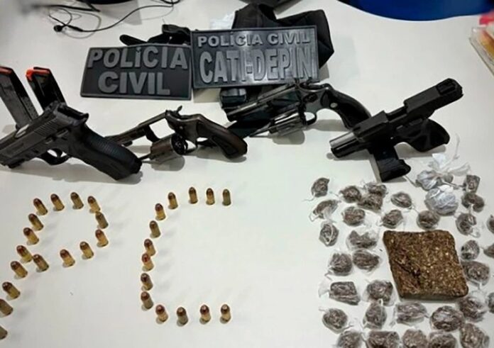 Além das armas, os policiais civis encontraram 39 buchas de uma substância semelhante à maconha, de cor verde, e um tablete maior da mesma substância.