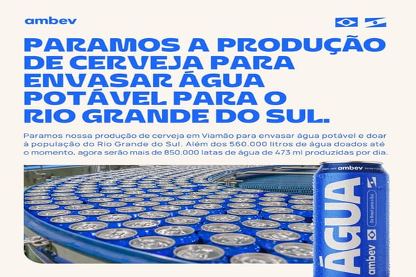A Ambev (ABEV3) comunicou nesta terça-feira (07) que vai parar a sua produção de cerveja em Viamão, na grande Porto Alegre (RS), para envasar água potável e doar à população do Rio Grande do Sul, com a distribuição prevista para começar na quarta-feira (08).